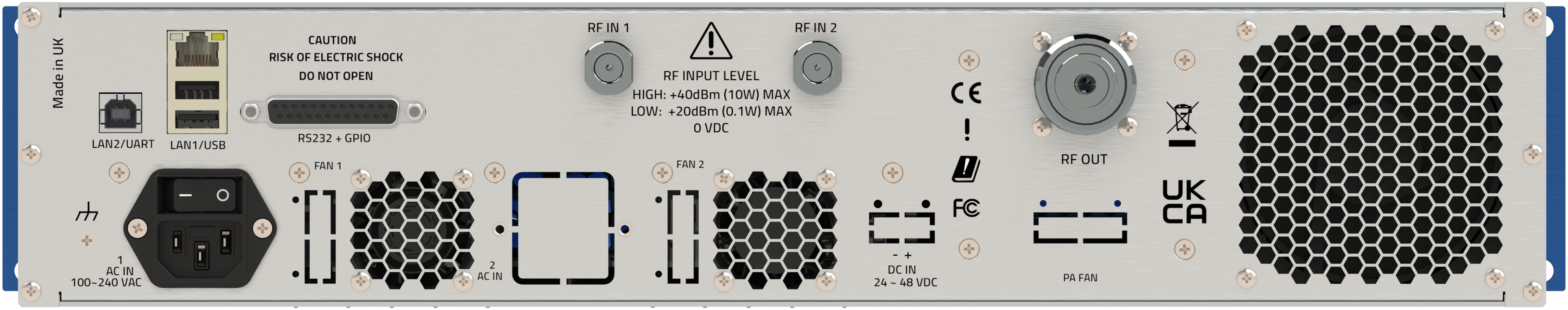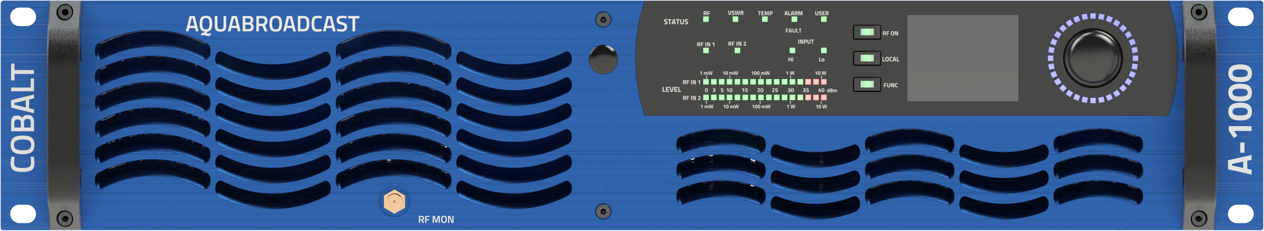 What sets our Amplifiers apart are their revolutionary Dual Input design with independent input RF power metering. If you have a 1+1 system or N+1 system using Cobalt exciters (C-10, C-30, C-50 or C-100) you can eliminate the need for any external changeover rack unit, as the dual drive system will take over if there is any issue. Saves Rackspace and $$$$. The A-1000 can accept two different Input drive levels. As standard, the A-1000 is set to HIGH mode (200mW to 10W, nominal 1W) on the RF Inputs. If you require the LOW mode (2mW to 100mW, nominal 10mW), you need to specify this when ordering.