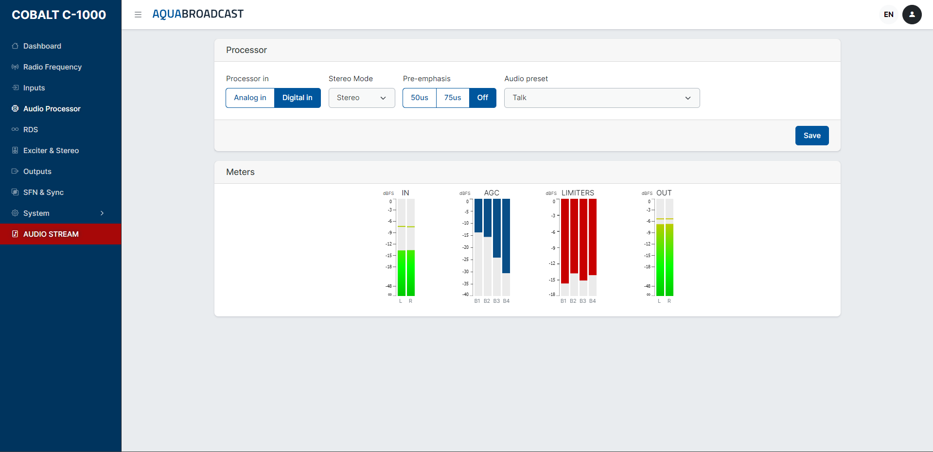 Aqua Broadcast has set up the unit with some default values that let you focus on testing the different presets with different types of music. You can play with all settings although only audio related parameters will have a noticeable effect on the audio.