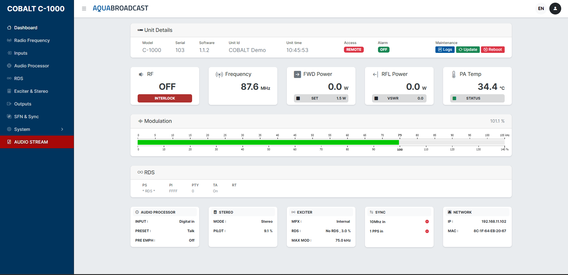 The COBALT series of FM transmitters offers an online demo that allows users to explore the product and its features, such as the built-in audio processor and the ability to play live audio tracks. The demo also showcases the ease of use and versatility of the COBALT transmitter.